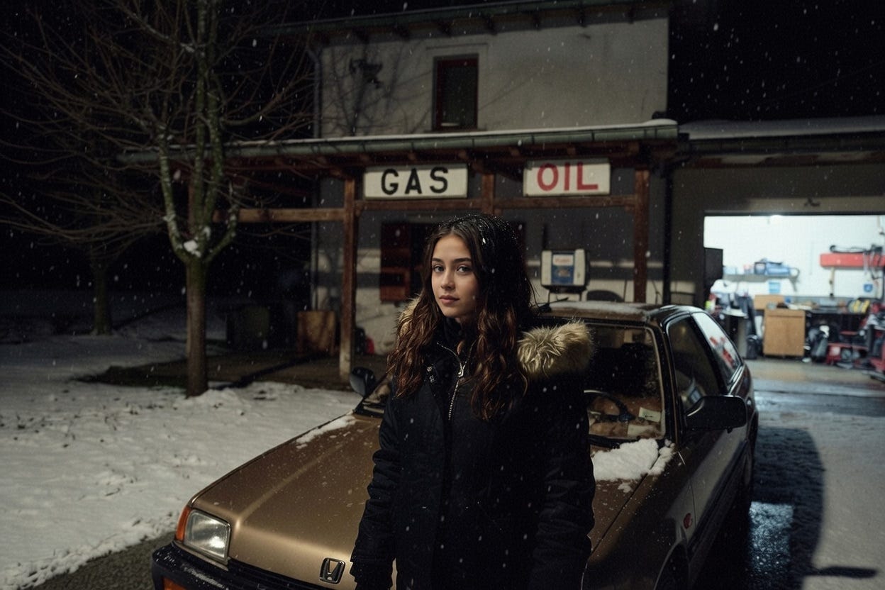 The windshield wipers fought a losing battle against the December snow, scraping rhythmically but achieving nothing more than pushing the snow from one side to the other. I squinted through the blurred glass, knuckles white against the steering wheel of my ancient Honda Civic. The dashboard lit up like a bloody Christmas tree—check engine, oil pressure, battery. Everything except the ‘you’re fucked’ light, though that one might as well have been flashing in neon.